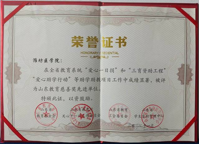 近日,山东省教育基金会、山东省教育厅关心下一代工作委员会、山东省教育工会委员会、山东省学生资助管理中心在全省教育系统开展了2017—2020年度“爱心一日捐”和“三育资助工程”“爱心助学行动”项目工作先进单位和先进个人评选活动。我校被评为山东教育慈善奖先进单位。